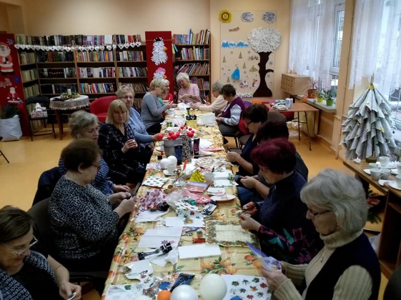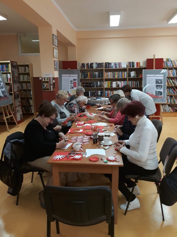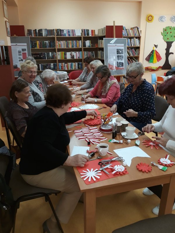 Panie przy kawie i angielskiej herbatce z dodatkiem pysznego ciasta domowego Pani Marii w radosnej atmosferze poczyniły przygotowania do obchodów 100 lecia Niepodległości. Ponad sto kotylionów jest przygotowanych dla gości na tą uroczystość.