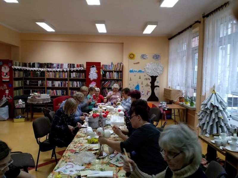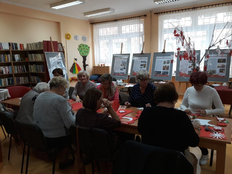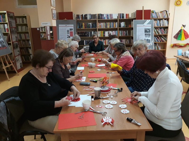 Panie przy kawie i angielskiej herbatce z dodatkiem pysznego ciasta domowego Pani Marii w radosnej atmosferze poczyniły przygotowania do obchodów 100 lecia Niepodległości. Ponad sto kotylionów jest przygotowanych dla gości na tą uroczystość.